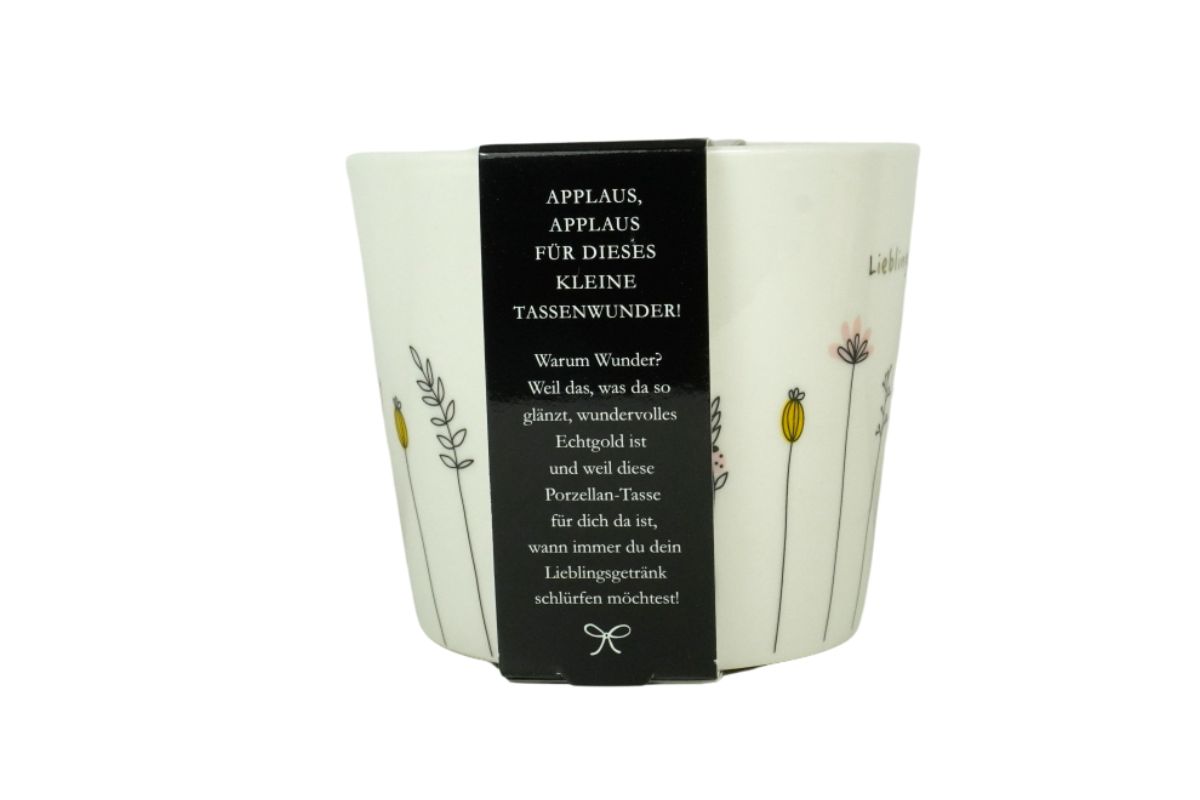 Applaus, Applaus… für dieses Tassenwunder! Warum Wunder? Weil das, was da so glänzt, wundervolles Echtgold ist und du mit dieser Porzellan Tasse wann immer du möchtest dein Lieblingsgetränk genießen kannst.