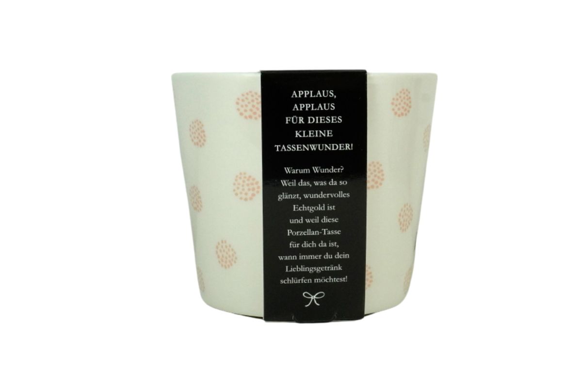 Applaus, Applaus… für dieses Tassenwunder! Warum Wunder? Weil das, was da so glänzt, wundervolles Echtgold ist und du mit dieser Porzellan Tasse wann immer du möchtest dein Lieblingsgetränk genießen kannst.