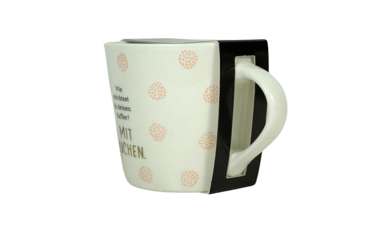 Grafik Werkstatt Henkelbecher Kaffeebecher Sprüchetasse Wie möchtest du deinen Kaffee? Mit Kuchen