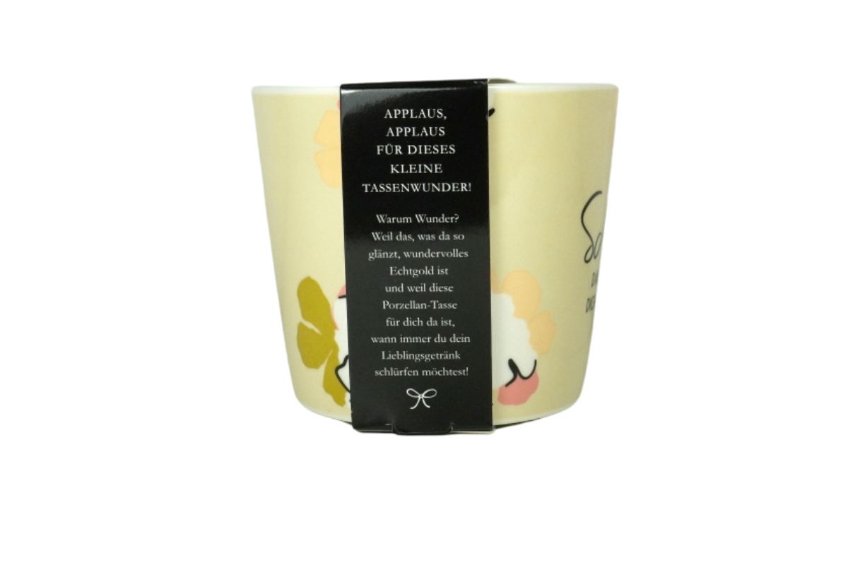 Applaus, Applaus… für dieses Tassenwunder! Warum Wunder? Weil das, was da so glänzt, wundervolles Echtgold ist und du mit dieser Porzellan Tasse wann immer du möchtest dein Lieblingsgetränk genießen kannst.